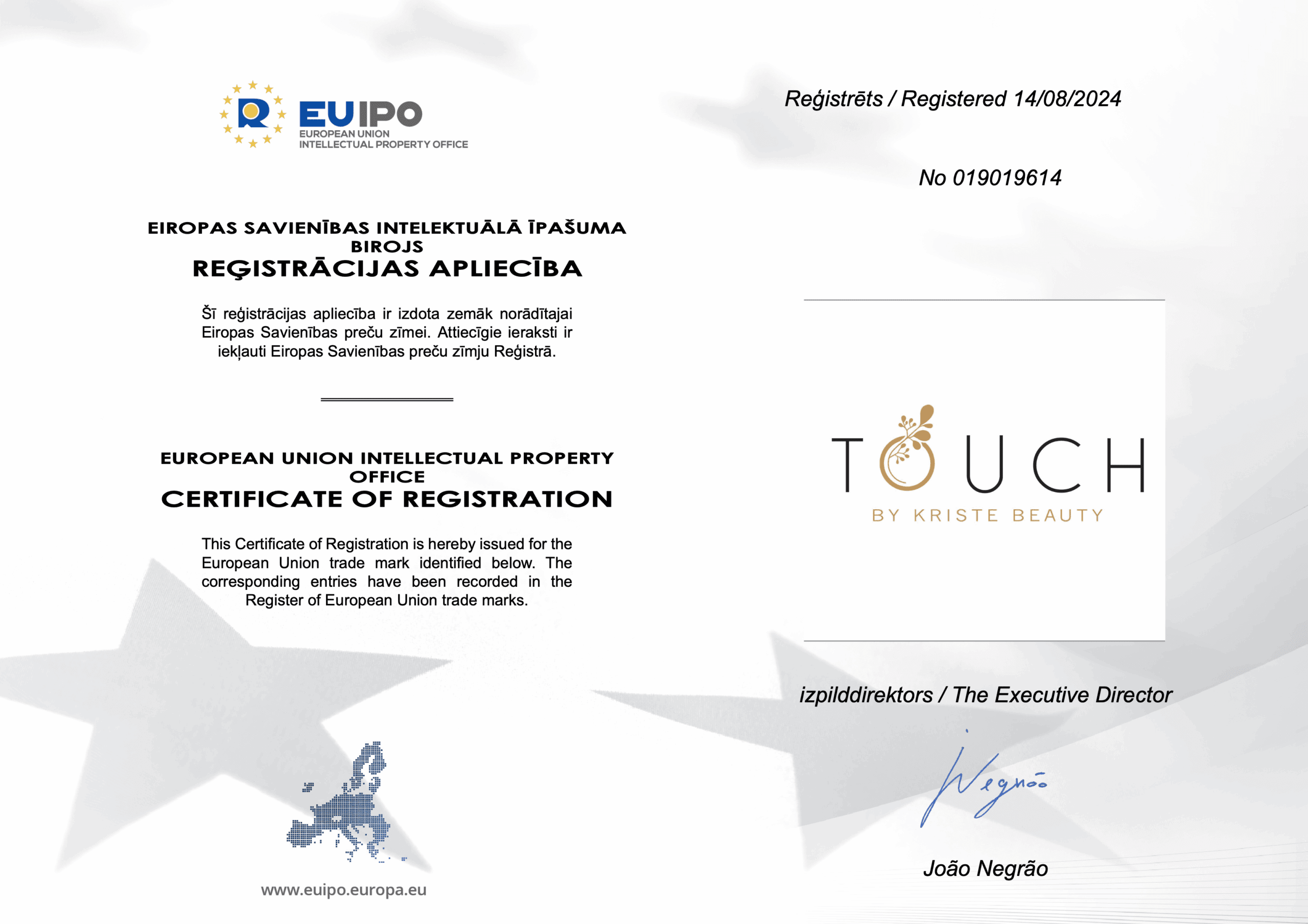 TOUCH by Kriste Beauty ir oficiāli reģistrēta preču zīme Eiropas savienībā (EUIPO). Tas apliecina, ka preču zīme ir aizsargāta visās Eiropas savienības valstīs. Zīmols, kurš radīts ar milzīgu sirds siltumu un uzticību vietējām vērtībām un dzimis Latvijā, bet gatavs atplest spārnus visā Pasaulē!