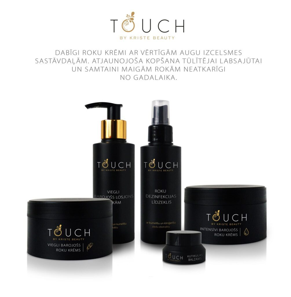 Latvijas dabas spēka iedvesmoti un manikīra meistares radīti roku kopšanas produkti ar dabīgas izcelsmes izejvielām, tostarp Latvijas augu ekstraktiem un dabīgajām eļļām. Es ticu, ka viss, kas mūsu vitalitātei, veselībai, enerģijai vajadzīgs, aug tepat – Latvijas laukos, pļavās un mežos. Mēs šo dabas spēku un maģiju ieliekam TOUCH produktos, lai Tava āda saņemtu pašu labāko – savu daļiņu Latvijas. Augstas kvalitātes dabiski komponenti – ceļmallapu, kumelīšu, kliņģerīšu, bērza lapu, smiltsērkšķu lapu ekstrakti, vīnogu kauliņu eļļa, šī sviests, bišu vasks un citi. Šīs sastāvdaļas ir rūpīgi izvēlētas, lai sniegtu Tavai ādai dabisku, bet efektīvu kopšanu. Radīts profesionāļiem darbā ar klientiem skaistumkopšanas salonos, bet piemērots lietošanai ikvienam. Mēs īpaši rūpējamies par to, lai bagātīgās produktu formulas būtu drošas un maigas gan pieaugušajiem, gan bērniem.